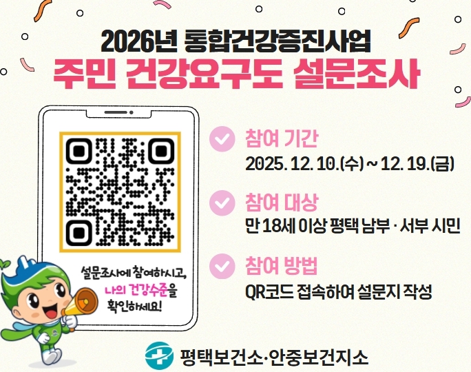 참여 방법은 평택시 평택보건소 누리집 등에 게시된 정보무늬(QR코드)를 통한 온라인 방식으로 진행된다.