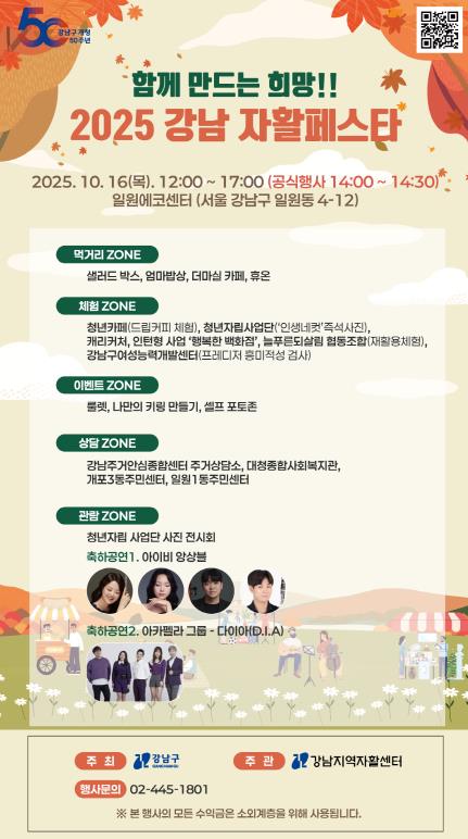 이번 행사는 자활사업의 의미를 널리 알리고, 자활근로 참여자의 자립 의지를 응원하기 위해 마련됐다. 강남구에는 강남지역자활센터를 중심으로 운영 중인 18개 자활근로사업단과 4개 자활기업에서 300여 명이 활동 중이다. 이번 행사를 통해 자활사업 참여자와 관계자 등이 구민들과 직접 만나 사업 성과를 알리고, 다양한 먹거리·서비스·제품을 홍보할 예정이다.