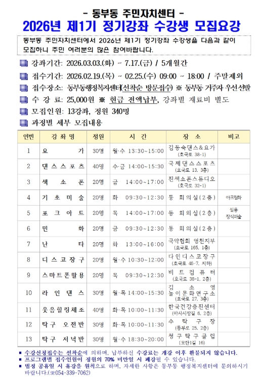 신청은 기간 내 동부동 행정복지센터 방문을 통해 선착순으로 접수할 수 있으며, 수강료는 5개월 기준 25,000원(재료비 등 별도)이다.