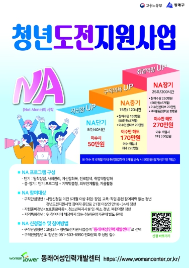 청년 도전 지원 사업은 상시 모집으로 진행되며, ‘NA(Not Alone)의 시작’을 함께하고 싶은 청년은 동래여성인력개발센터로 문의하면 된다.