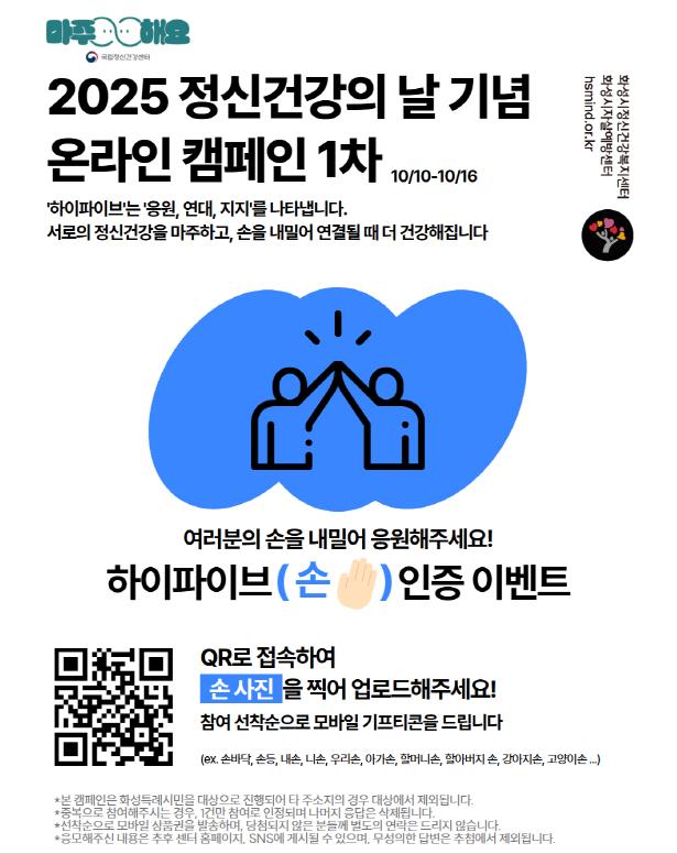 시민 누구나 참여할 수 있는 온라인 캠페인은 2회에 걸쳐 진행된다. 1차는 10일부터 오는 16일까지로, 서로에게 응원의 손을 내민다는 의미의 ‘하이파이브 손 인증 캠페인’이 운영되며, 2차는 오는 17일부터 24일까지 서로의 마음을 이해하고 지지하는 ‘마주해요 N행시 캠페인’이 운영된다.