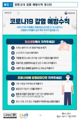 아울러, 고위험군이 많이 이용하는 의료기관, 요양병원, 장기요양기관 등 감염취약시설에는 종사자, 보호자, 방문자들이 마스크를 착용할 수 있도록 안내하고, 실내 공기를 주기적으로 환기하는 등 코로나 19 감염 예방수칙을 강화해 달라고 전했다.