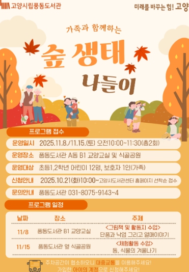 총2회 차로 구성된 이번 프로그램은 11월 8일과 15일, 오전 10시부터 11시 30분까지 풍동도서관 A동 지하 1층 교양교실과 식골공원(풍동도서관)에서 진행한다.