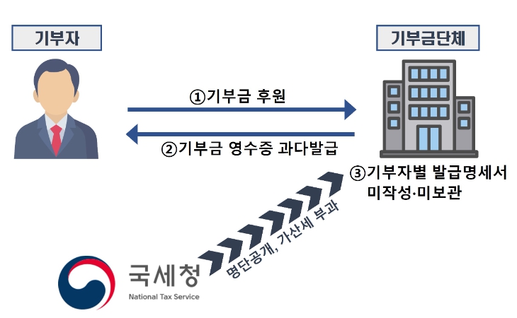 불성실 기부금수령단체는 거짓 기부금영수증을 발급했거나 상속세 및 증여세법에 따른 의무의 불이행으로 세금을 추징당한 단체 등으로, 이번에는 실제 기부금 수령액보다 많은 금액으로 거짓 기부금영수증을 발급한 종교단체, 출연자 또는 그의 특수관계인을 임・직원으로 고용하여 1천만 원 이상 증여세를 추징당한 단체 등 24개를 공개했다.