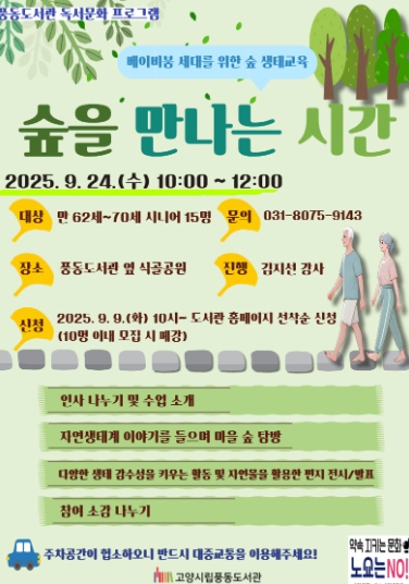 이 프로그램은 62세 ~ 70세의 고양시민 15명을 대상으로 하며, 9월 24일 오전 10시부터 12시까지 풍동도서관 옆 식골공원에서 약 2시간 동안 진행한다.
