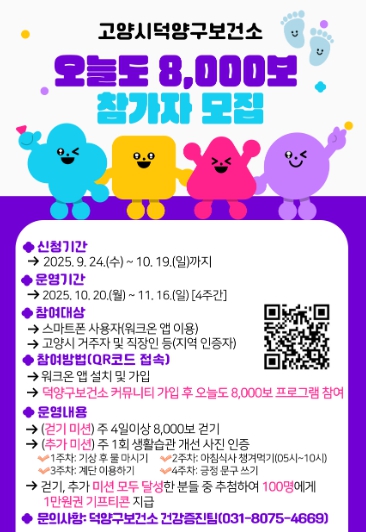 참여 신청은 9월 24일부터 가능하다. 참여 방법은 안내문 정보무늬(QR코드)를 통해 접속하거나, 구글 플레이스토어 또는 앱스토어에서 ‘워크온’을 검색해 설치 및 가입 후 ‘고양시덕양구보건소’ 커뮤니티의 바로가기를 통해 ‘오늘도 8,000보’ 프로그램에 ‘참여하기’버튼을 누르면 된다.