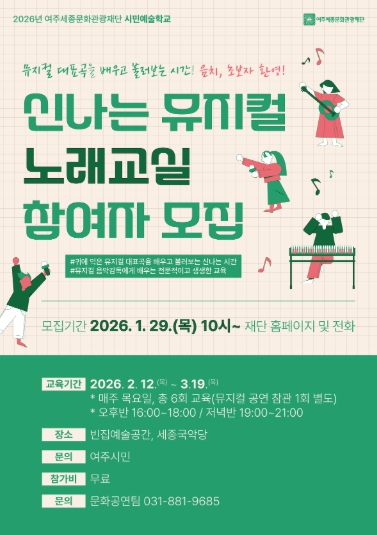 한편 이번 교육을 포함한 재단의 다양한 문화예술교육 및 공연 관련 정보는 여주세종문화관광재단 홈페이지에서 확인할 수 있다.