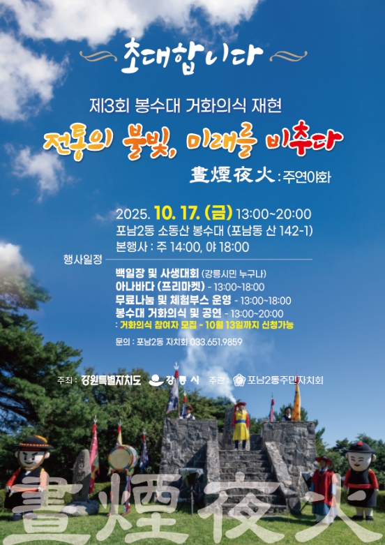 2023년 도내 최초 봉수대 거화 의식에 이어 올해 세 번째 주연야화(晝煙夜火) “전통의 불빛, 미래를 비추다”로 개최되는 이번 행사는 17일(금) 오전 10시부터 백일장 및 사생대회, 아나바다(프리마켓), 체험행사(다도, 민속놀이) 등 다양한 프로그램을 진행하고, 오후 2시에는 순라의식, 본행사 시작인 오후 6시부터는 봉수대 불을 올리는 거화 의식 퍼포먼스를 연출하여 시민들에게 봉수대 터의 기능 및 의의를 널리 알리고, 전통문화 향유기회를 제공한다.