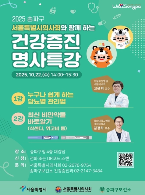 강연은 건강에 관심 있는 모든 구민을 대상으로 무료로 진행한다. 참여 신청은 송파구 건강증진과(☎ 2147-3484)로 전화하거나 QR코드를 통해사전 접수하면 된다. 300명 선착순 모집한다.