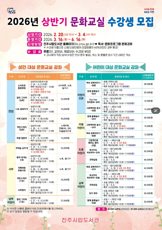 수강 신청은 2월 20일 오전 10시부터 3월 4일 오후 6시까지 진주시립도서관 누리집에서 선착순으로 접수한다. 수강료는 무료이며, 교재비(재료비)는 본인 부담이다.