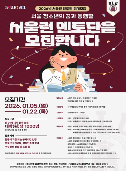 한편 서울시는 멘티와 멘토의 동반 성장을 지원하기 위해 기존의 멘토 정기 교육을 ‘멘토스쿨’로 새롭게 개편하고, 사회 초년생을 위한 ‘진로 멘토링’도 함께 운영한다.