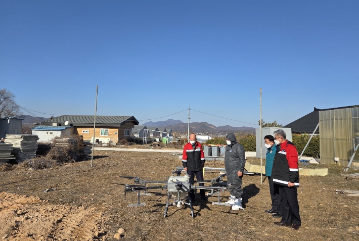 시는 일반적인 인력 투입 및 소독장비로 접근이 어려운 축사 지붕 등에 방제전문 드론(DJI T30)을 투입함으로서, 방역 사각지대 해소를 목표로 하고 있다.