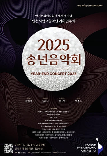 음악으로 따뜻한 위로와 감동을 전할 인천시립교향악단 기획연주회 '2025 송년음악회'는 전석 1만 원으로, 인천문화예술회관과 아트센터인천 누리집, 엔티켓 및 NOL 티켓에서 예약 가능하다.