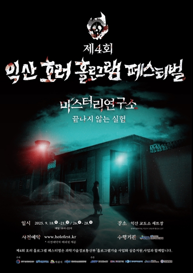 올해 4회째를 맞은 “익산 호러 홀로그램 페스티벌”은 홀로그램 기술과 호러를 융합한 이색 공포 축제로, 9월 18일일부터 21일까지, 9월 26일부터 28일까지 총 7일간 매일 18:00~22:00 운영한다. 특히 사전예약자가 1만 3천 명을 돌파하며 높은 관심을 입증했다.