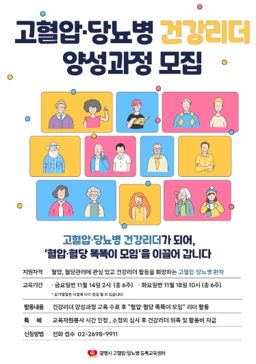 참여 대상은 혈압·혈당 관리에 관심이 있고 건강리더로 활동을 희망하는 고혈압 또는 당뇨병 환자다.