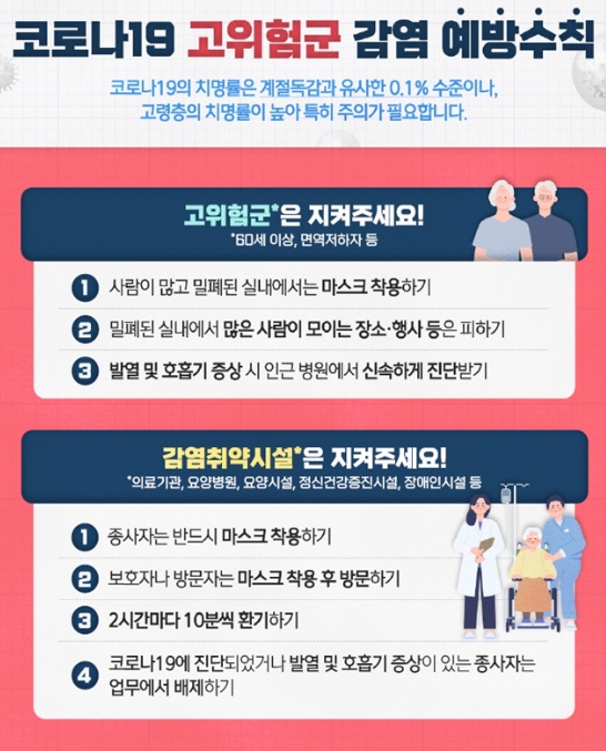 특히 고위험군인 어르신과 기저질환자를 감염으로부터 보호하기 위해서는 실내 행사나 사람이 많은 밀폐·밀집 공간에서 마스크를 착용하고, 손 씻기, 기침 예절 등 기본 예방수칙을 철저히 지키는 것이 무엇보다 중요하다.