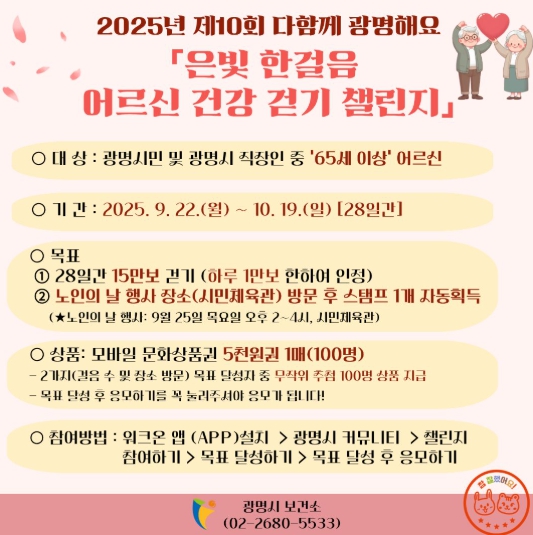 이번 챌린지는 65세 이상 어르신을 대상으로 오는 22일부터 10월 19일까지 28일간 진행하며, 모바일 걷기 플랫폼 ‘워크온’에서 참여할 수 있다.