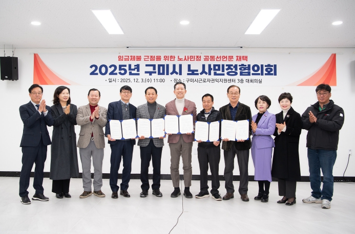 회의는 2025년 노사민정협의회 주요 추진사업 보고 후 ‘임금체불 근절을 위한 구미시 노사민정 상호협력 공동선언문’ 채택으로 이어졌다. 선언문에는 노‧사‧민‧정이 각자의 역할을 성실히 수행해 임금체불 없는 건강한 노동환경을 만들고, 기업의 지속가능한 성장과 지역경제 활성화를 함께 추진하겠다는 의지가 담겼다.