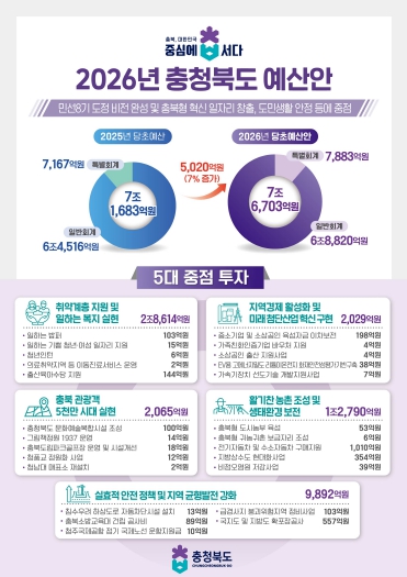 2026년도 예산안은 금년도 당초예산 7조 1,683억원보다 5,020억원(7.0%)이 증가한 7조 6,703억원 규모다. 일반회계는 4,304억원(6.7%) 증가한 6조 8,820억원, 특별회계는 716억원(10.0%) 증가한 7,883억원이다.