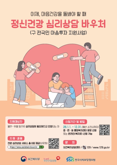 신청은 예산 소진 시까지 연중 가능하며, 신분증과 관련 증빙서류를 지참해 거주지동주민센터를 방문하거나, 만 19세 이상 성인은 ‘복지로’ 누리집을 통해 온라인 신청할 수 있다. 선정 후에는 주소지와 관계없이 원하는 제공기관을 선택해 상담을 받을 수 있다.