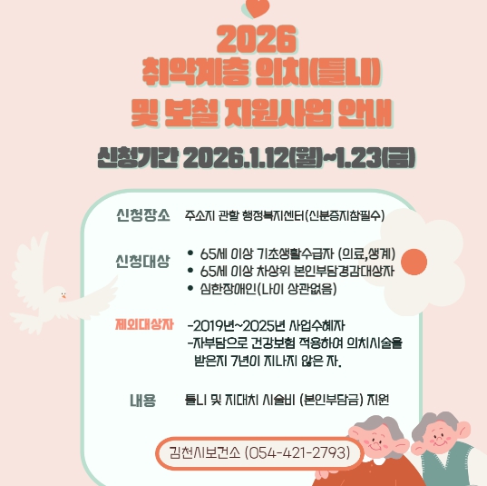희망자는 2026년 1월 12일부터 1월 23일까지 주소지 읍면동 행정복지센터로 신청하면 된다. 지원 대상은 65세 이상 국민기초생활수급자(생계급여, 의료급여) 및 차상위본인부담경감대상자, 나이와 상관없는 심한 장애인이며, 사업을 통해 완전의치, 부분의치에 따른 시술비(본인부담금)와 의치 시술에 따른 지대치(최대 6개)를 지원한다.