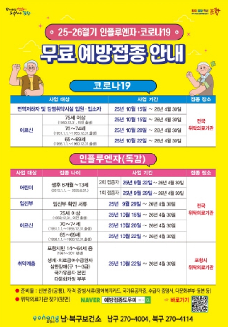 김정임 포항시 남구보건소장은 “최근 코로나19 입원환자가 증가하는 등 확산세가 이어지고 있는 만큼, 65세 이상 어르신 등 고위험군은 일정에 맞춰 가까운 지정 의료기관을 방문해 반드시 접종을 받길 바란다”고 당부했다.