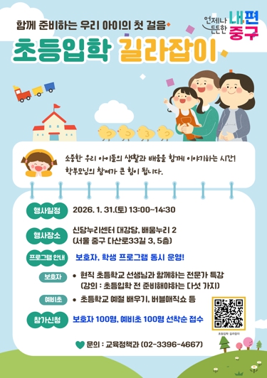 구 관계자는 “초등학교 입학은 아이와 부모 모두에게 설렘과 걱정이 함께하는 새로운 출발”이라며“중구가 준비한 입학 지원 프로그램이 즐거운 학교생활의 밑거름이 되길 바란다”고 전했다.
