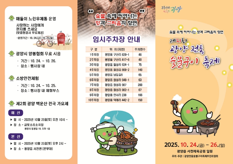 부대행사로는 서천무지개분수를 배경으로 한 에어바운스 ‘매돌이 포토존’, 수변무대 버스킹, 한우 시식회, 광양불고기 마그넷 만들기, 숯불구이 테마관 운영, ‘구경구미’ 컬러링 엽서 체험 등 광양의 문화를 보고, 먹고, 즐길 수 있는 다양한 프로그램이 준비됐다.