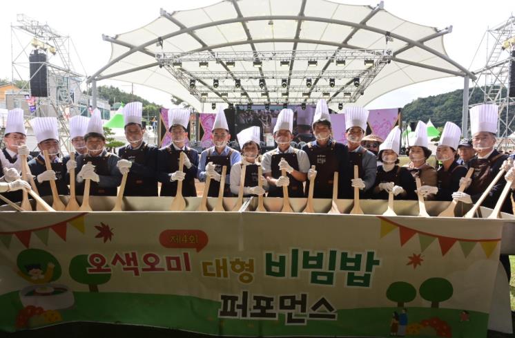 개막 첫날, 청정 봉화의 농산물이 한 그릇에 담긴 ‘오색오미 대형 비빔밥 퍼포먼스’가 축제의 서막을 알렸다.