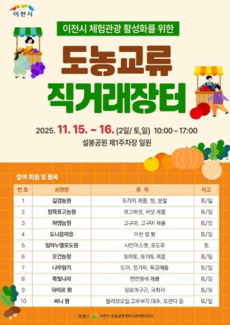 이천시 관광과 관계자는 “이번 장터는 단순한 판매 행사를 넘어, 도시 소비자와 농촌 생산자가 직접 소통하며 신뢰를 쌓는 의미 있는 자리가 될 것”이라며 “앞으로도 도농복합도시로서 이천만의 농촌체험관광 매력을 널리 알리겠다”라고 말했다.