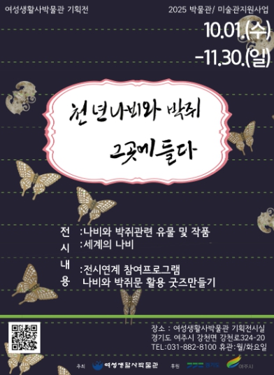 이번 전시에는 여성생활사박물관 소장품 중 나비와 박쥐로 꾸며진 선조들의 삶이 녹아있는 유물과 장자의 철학적 우화 ‘호접지몽’을 작품으로 표현한 도자 작품, 전 세계에서 채집된 나비의 아름다움을 감상할 수 있는 전시이다. K-컬쳐에 대한 관심과 환호 열풍에 지구촌이 떠들썩한 요즈음 우리에게 익숙한 것이 세계의 시선과 감성을 사로잡는 트랜드가 되어 자긍심에 부풀어 있는 지금, 작게나마 문화의 깊이를 이해하고 느껴보는 기회가 될 것이다.