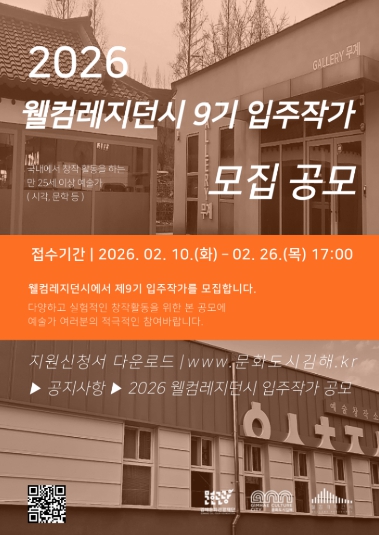 웰컴레지던시는‘장유 문화마을 도시조성사업’을 통해 2020년 조성된 예술가 레지던시 공간으로, 지난 6년간 총 52명의 입주작가를 배출하며 지역 기반 창작 활동을 꾸준히 지원해 왔다.