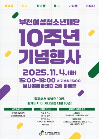 이번 10주년 기념행사는 재단과 함께 사업을 펼쳐 온 관계자, 그리고 시민 누구나 참여할 수 있는 열린 행사로, 참여와 나눔의 의미를 담았다. 행사에서는 재단 10년간 활동을 담은 성과 전시, 재단과 협력해 온 지역사회 구성원(기관·단체·활동가 등)에 대한 감사장 수여, 10주년 임팩트 보고, 그리고 재단의 비전 공유 세레모니 등이 진행된다.