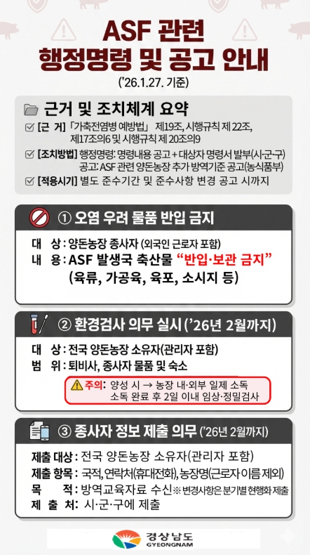 정창근 경상남도 동물방역과장은 “최근 아프리카돼지열병 발생 양상을 고려할 때 경남도 안심할 수 없는 상황”이라며, “농가에서는 농장 진입 차량과 사람에 대한 소독, 전용 작업복‧작업화 착용 등 기본 방역수칙을 철저히 지켜주시길 바란다”고 말했다.
