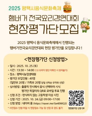 전국 요리경연대회는 ‘평택의 맛, 나만의 아이디어로 버거를 완성하다’를 주제로 총 18팀(일반부 10, 가족부 8)이 본선에 진출해 열띤 경연을 펼친다. 지난해와 달리 참가 부문이 일반부와 가족부로 확대됐으며, 시상 규모도 10팀 740만 원으로 늘어나 큰 기대를 모으고 있다.