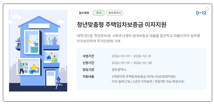 이 사업은 청년이 전‧월세 임차보증금을 대출할 때 발생하는 이자를 일부 지원하는 사업이다. 광주시가 대상자를 선정하면 광주은행이 대출을 실행하고 한국주택금융공사가 대출을 100% 보증한다.