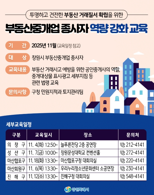 이번 교육은 창원시 부동산중개업종사자 1천 9백여 명을 대상으로 11월 4일부터 11월 18일까지 창원시 5개 구청 별로 실시된다.