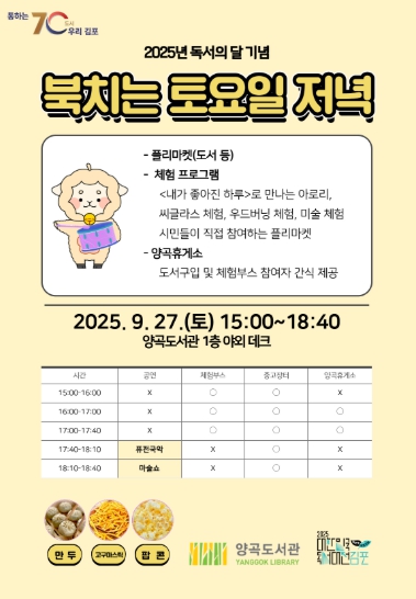독서의 달을 맞이하여 개최하는 ‘북치는 토요일 저녁’은 더욱 친근하고 즐거운 도서관이 되기 위해 마련한 행사로, 김포시민의 독서 진흥을 위해 기획됐다.