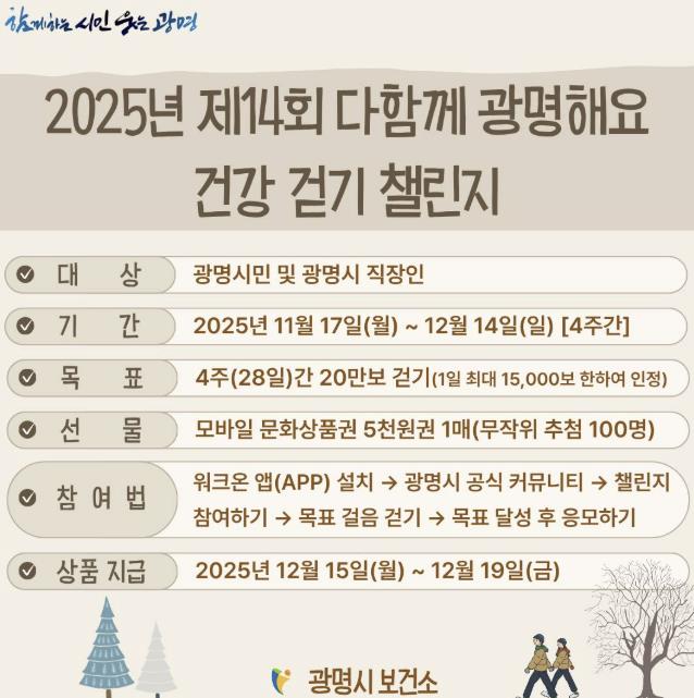 ‘제14회 다함께 광명해요 건강 걷기 챌린지’는 4주 동안 총 20만 보 걷기를 목표로 진행한다. 1일 최대 1만5천 보까지 인정하며, 참가자는 워크온 앱으로 걸음 수를 기록하고 목표를 달성하면 응모할 수 있다. 완주자 중 추첨을 통해 100명에게 모바일 문화상품권(5천 원권)을 증정한다.