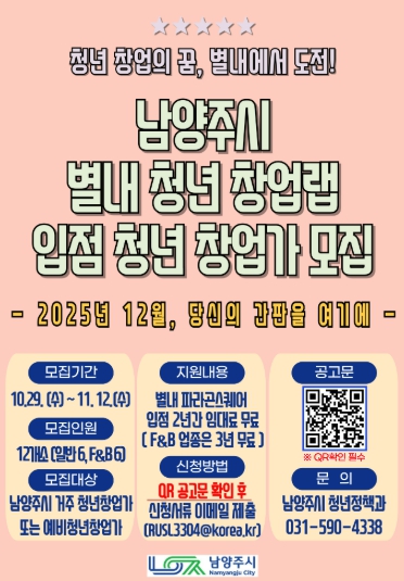 이번 사업은 ㈜라인건설과 협력해 별내동 파라곤 스퀘어 내 유휴 상가 공간을 창업 공간으로 무상 지원하는 민관 협력형 청년 창업 활성화 프로젝트다. 시는 본 사업을 통해 창업 초기 비용 부담을 줄이는 등 청년들이 마음껏 창업에 도전할 수 있도록 지원한다.