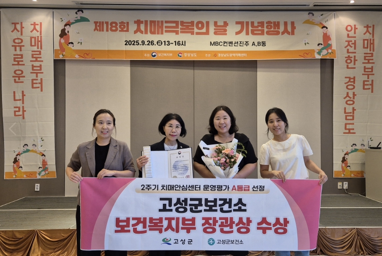 최문숙 건강증진과장은 “이번 수상은 치매 극복을 위한 고성군민들의 관심과 참여가 만든 성과”라며, “앞으로도 치매가 있어도 안심할 수 있는 고성군을 만드는 데 최선을 다하겠다”라고 말했다.