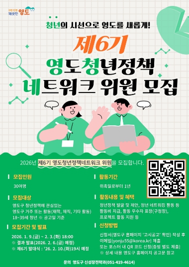 모집 인원은 30명 내외로, 영도구에 거주하거나 재학·재직·활동 중인 만 18세부터 39세까지의 청년이면 누구나 지원할 수 있다. 선발된 위원들은 2월 발대식을 시작으로 1년간 활동하게 된다.
