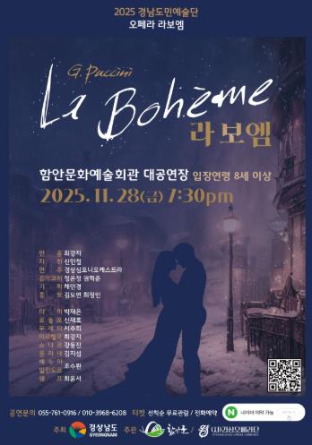 함안군 관계자는 “이번 오페라 '라보엠' 공연을 통해 오페라의 예술적 깊이를 유지하면서도 대중적 접근성을 높여 젊은 세대와 일반 관객 모두가 오페라를 쉽게 이해할 수 있는 기회를 제공할 것으로 기대한다”면서 “전석 초대 공연을 통하여 지역민의 문화예술 향유 기회를 확대하고, 지역 공연예술 활성화에도 긍정적 효과가 있을 것이다.”고 밝혔다.
