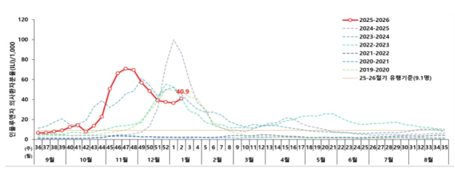 질병관리청에서 운영 중인 표본감시 결과, 의원급 의료기관의 인플루엔자 의사환자 분율은 11월 중순(‘25년 47주차) 이후 감소 추세를 보이다, ’26년 2주차(1.4.~1.10.) 에는 외래환자 1,000명당 40.9명으로 전주(36.4명) 대비 소폭 증가하면서, 이번 절기 유행기준(9.1명)보다 높은 수준으로 유행이 지속되고 있다.