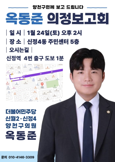 옥 의원은 신정4동과 신월2동을 중심으로 현장 중심의 의정활동을 이어오며 조례 제·개정과 예산 확보 등 지역 현안 해결에 힘써왔고, 이번 자리에서 그 구체적인 성과를 주민들과 나눌 예정이다.