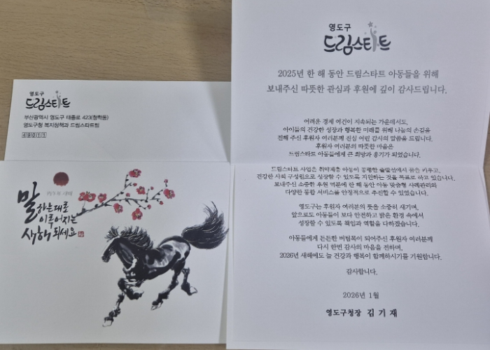 영도구 관계자는 “어려운 여건 속에서도 드림스타트 아동들의 든든한 버팀목이 되어주신 후원자 여러분께 진심으로 감사드린다”며 “앞으로도 드림스타트 아동들이 건강하고 행복하게 성장할 수 있도록 다양한 후원처 발굴과 민관 협력에 더욱 힘쓰겠다”고 전했다.
