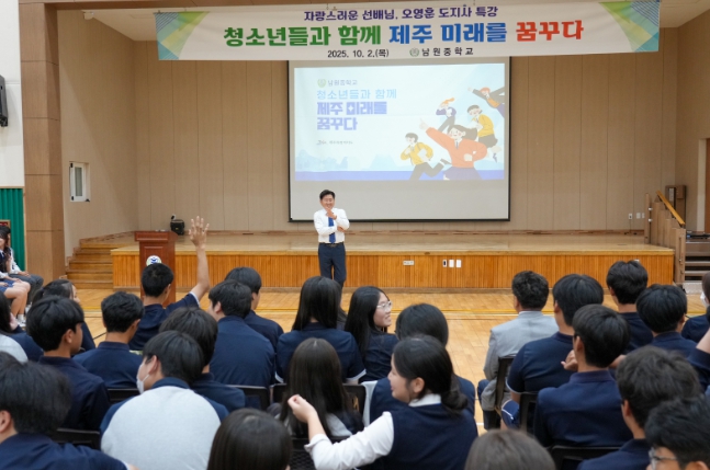 이날 강연은 전교생 약 240명이 참석한 가운데 ‘청소년들과 함께 제주 미래를 꿈꾸다’를 주제로 진행됐다. 이번 특강은 2024년 표선고, 한림공고, 한국국제학교(KIS), 2025년 제주중앙고, 중문고에 이어 여섯 번째로 마련된 자리로, 앞으로도 도내 중·고교 학생들과의 만남을 꾸준히 이어갈 계획이다.