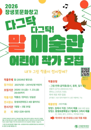 모집 대상은 ‘말(馬)’을 주제로 한 어린이의 자유로운 상상력과 개성이 담긴 회화·동시 작품이며 전시 기간 동안에는 작품 감상과 연계한 가족 참여형 포토존과 간단한 체험 프로그램도 함께 운영된다.