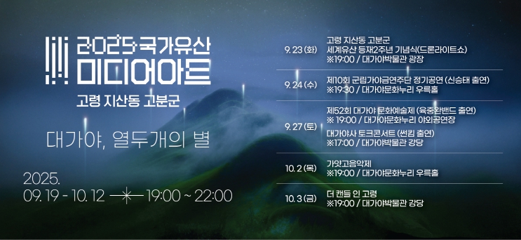 ‘2025 국가유산 미디어아트 고령 지산동 고분군’은 국가유산 가치를 확산하고 야간콘텐츠 활성화를 위해 국가유산청과 경상북도, 고령군이 주최하고 국가유산진흥원이 주관하는 국가적 행사이다.