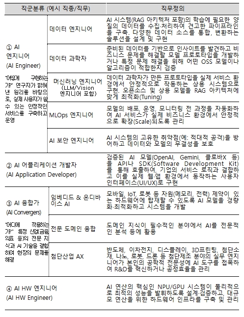 「AI 캠퍼스」는 AI 산업 인력수요와 국내외 AI 직무분류를 고려해 ‘AI 엔지니어’, ‘AI 어플리케이션 개발자’, ‘AI 융합가’, ‘AI 하드웨어 엔지니어’ 등 4개 직군의 실무 인력 양성을 목표로 한다. 참여를 희망하는 기관은 이와 같은 인력 양성 목표에 맞게 훈련과정을 설계해야 하며, 기업의 현업 문제를 반영한 프로젝트 학습 비중을 30% 이상 편성해야 한다.